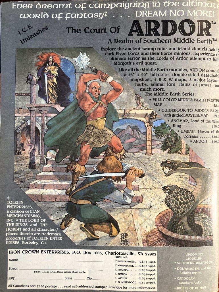 A supplement for Middle-earth Role Playing (MERP), a role-playing game set in J.R.R. Tolkien’s Middle-earth. This source book introduced players to a new region of Middle-earth, Ardor, and provided additional adventures, characters, and details for the MERP gaming experience.