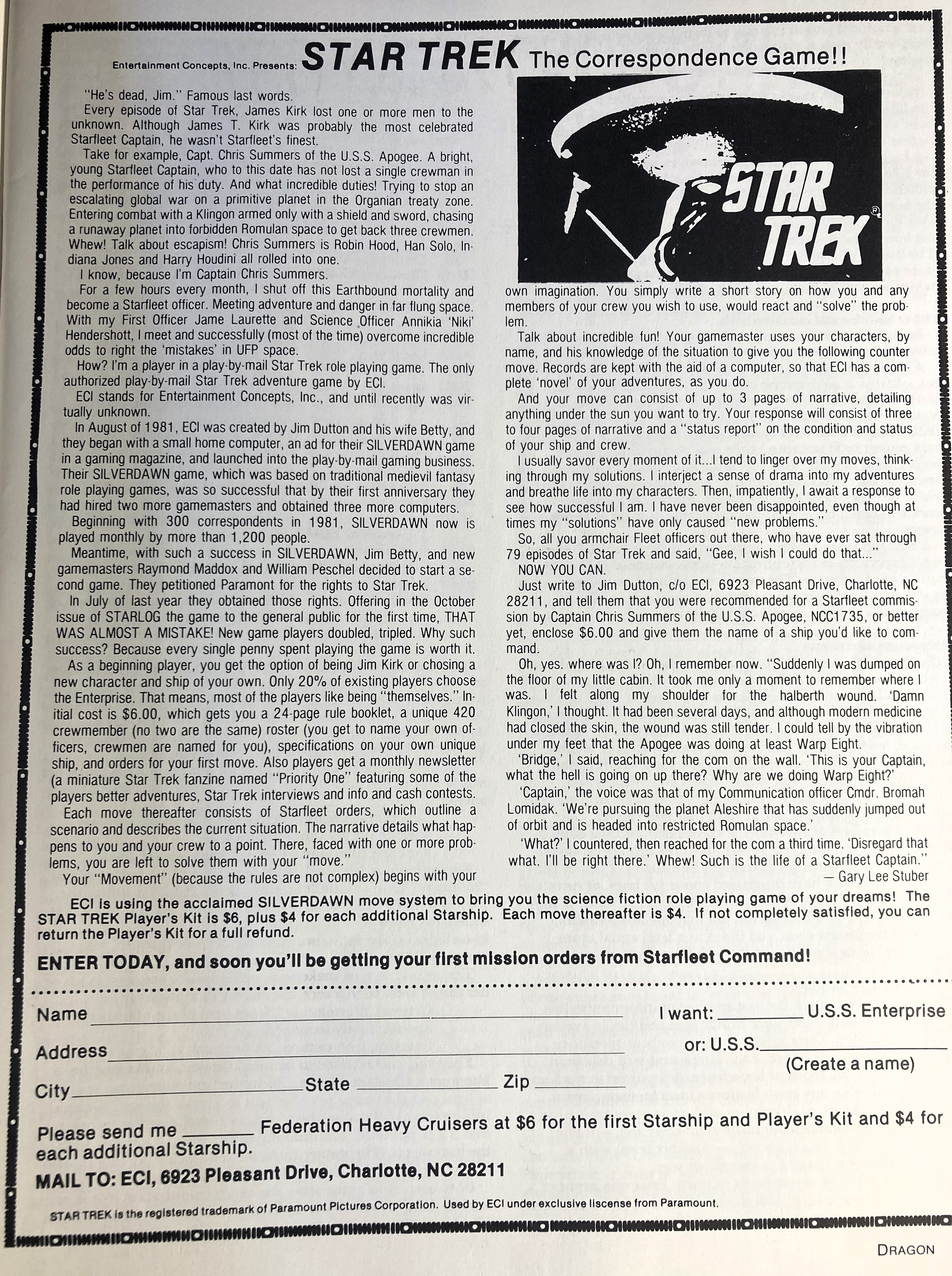 I digress. This ad was for Star Trek: The Correspondence Game. It was a play-by-mail game that allowed participants to immerse themselves in the Star Trek universe. Players would take on the roles of starship captains, crew members, and other key personnel. The game was played through written correspondence, where players would send orders, reports, and other interactions to the game master via postal mail. Get a load of those $4/move rates. That seems high, even by today’s standard.