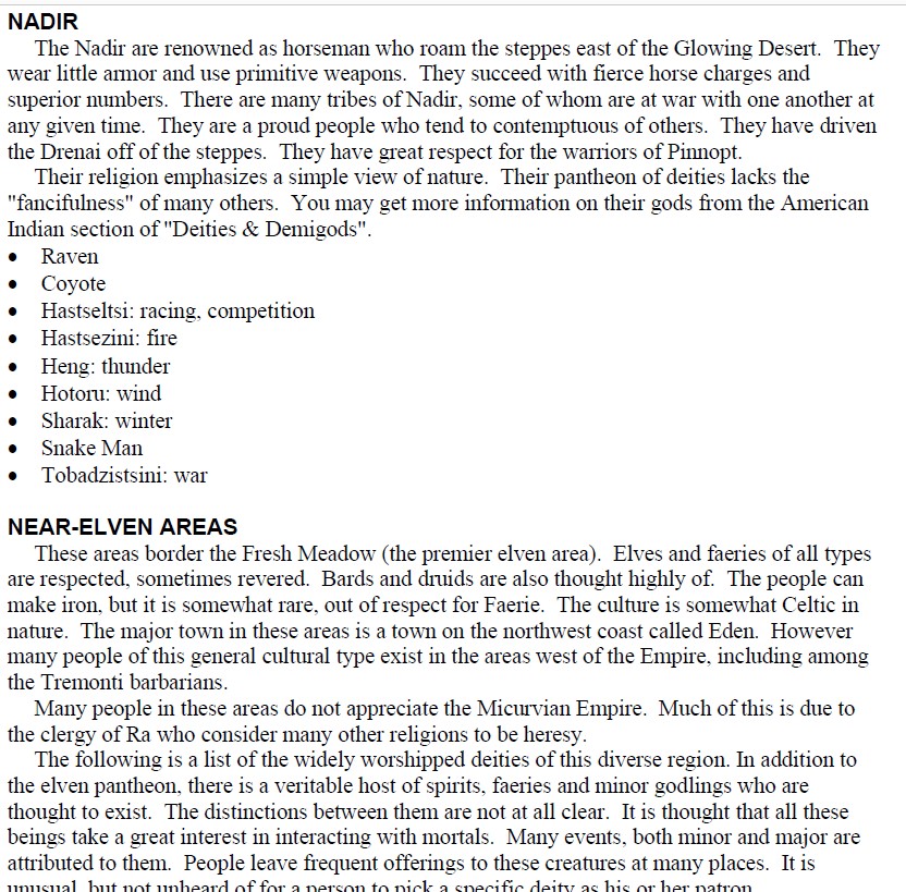 Natural questions develop about certain regions such as “What is the capital city of _____?” or “What deities are worshipped in _______?” I generally do not know the answers to these questions until they are asked but am able to create them once I know that they are of particular interest to my players. As I do, I jot them down and add them into the document. In this way I am not filling in an entire campaign setting from scratch but merely focusing on the parts that are important to my players.